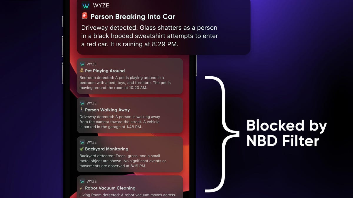 შეტყობინებების NBD-დ ან კრიტიკულად გასაფილტრად, Wyze იყენებს ხელოვნურ ინტელექტს ვიდეო კადრების გასაანალიზებლად და მათი შეფასებისთვის. ამჟამად, Wyze კონსერვატიულია შეტყობინებების გაფილტვრისას და მხოლოდ 2-5 ქულის მქონე მოვლენებზე აგზავნის ტელეფონის შეტყობინებას. კომპანია აცხადებს, რომ მომავალში განიხილავს მომხმარებლების შემდგომ გამოხმაურებას, რათა პოტენციურად გამორიცხოს შეტყობინებები 1 და 2 ქულის მქონე მოვლენებიდან.